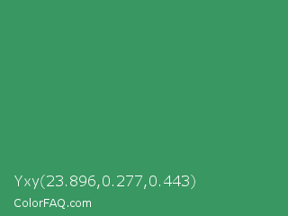 Yxy 23.896,0.277,0.443 Color is a normal green color and the nearest color is Chateau Green #40a860. Hex code #399761 and RGB value is rgb(57,151,97). In RGB color space, this color is composed of 22% red, 59% green, 38% blue, In CMYK color space, this color is composed of 62% cyan, 0% magenta, 36% yellow , 41% black , In HSL color space, this color has a hue angle of 146° , 45% saturation and 41% lightness.