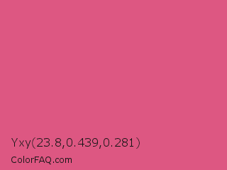 Yxy 23.8,0.439,0.281 Color is a normal rose color and the nearest color is Fandango Pink #de5285. Hex code #dd5782 and RGB value is rgb(221,87,130). In RGB color space, this color is composed of 87% red, 34% green, 51% blue, In CMYK color space, this color is composed of 0% cyan, 61% magenta, 41% yellow , 13% black , In HSL color space, this color has a hue angle of 341° , 66% saturation and 60% lightness.
