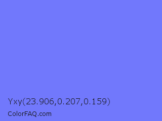 Yxy 23.906,0.207,0.159 Color is a light blue color and the nearest color is Very Light Blue #6666ff. Hex code #7178fc and RGB value is rgb(113,120,252). In RGB color space, this color is composed of 44% red, 47% green, 99% blue, In CMYK color space, this color is composed of 55% cyan, 52% magenta, 0% yellow , 1% black , In HSL color space, this color has a hue angle of 237° , 96% saturation and 72% lightness.