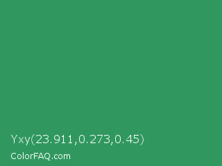Yxy 23.911,0.273,0.45 Color is a normal green color and the nearest color is Sea Green #2e8b57. Hex code #30985f and RGB value is rgb(48,152,95). In RGB color space, this color is composed of 19% red, 60% green, 37% blue, In CMYK color space, this color is composed of 68% cyan, 0% magenta, 38% yellow , 40% black , In HSL color space, this color has a hue angle of 147° , 52% saturation and 39% lightness.