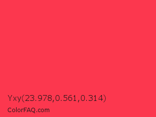 Yxy 23.978,0.561,0.314 Color is a normal red color and the nearest color is Red Salsa #fd3a4a. Hex code #fc374e and RGB value is rgb(252,55,78). In RGB color space, this color is composed of 99% red, 22% green, 31% blue, In CMYK color space, this color is composed of 0% cyan, 78% magenta, 69% yellow , 1% black , In HSL color space, this color has a hue angle of 353° , 97% saturation and 60% lightness.