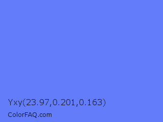 Yxy 23.97,0.201,0.163 Color is a light blue color and the nearest color is Blueberry #4f86f7. Hex code #627cfa and RGB value is rgb(98,124,250). In RGB color space, this color is composed of 38% red, 49% green, 98% blue, In CMYK color space, this color is composed of 61% cyan, 50% magenta, 0% yellow , 2% black , In HSL color space, this color has a hue angle of 230° , 94% saturation and 68% lightness.