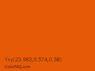 Yxy 23.983,0.574,0.38 Color is a normal orange color and the nearest color is Persimmon #ec5800. Hex code #e65906 and RGB value is rgb(230,89,6). In RGB color space, this color is composed of 90% red, 35% green, 2% blue, In CMYK color space, this color is composed of 0% cyan, 61% magenta, 97% yellow , 10% black , In HSL color space, this color has a hue angle of 22° , 95% saturation and 46% lightness.