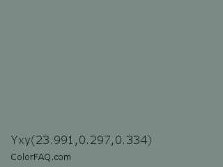Yxy 23.991,0.297,0.334 Color is a normal cyan color and the nearest color is Blue Smoke #748881. Hex code #798a87 and RGB value is rgb(121,138,135). In RGB color space, this color is composed of 47% red, 54% green, 53% blue, In CMYK color space, this color is composed of 12% cyan, 0% magenta, 2% yellow , 46% black , In HSL color space, this color has a hue angle of 169° , 7% saturation and 51% lightness.