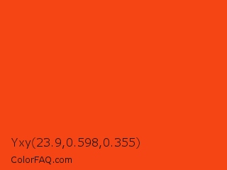 Yxy 23.9,0.598,0.355 Color is a normal red color and the nearest color is Orioles Orange #fb4f14. Hex code #f64514 and RGB value is rgb(246,69,20). In RGB color space, this color is composed of 96% red, 27% green, 8% blue, In CMYK color space, this color is composed of 0% cyan, 72% magenta, 92% yellow , 4% black , In HSL color space, this color has a hue angle of 13° , 93% saturation and 52% lightness.
