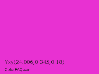 Yxy 24.006,0.345,0.18 Color is a normal magenta color and the nearest color is Razzle Dazzle Rose #ff33cc. Hex code #e831d2 and RGB value is rgb(232,49,210). In RGB color space, this color is composed of 91% red, 19% green, 82% blue, In CMYK color space, this color is composed of 0% cyan, 79% magenta, 9% yellow , 9% black , In HSL color space, this color has a hue angle of 307° , 80% saturation and 55% lightness.