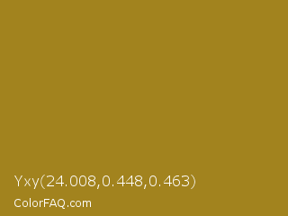 Yxy 24.008,0.448,0.463 Color is a normal yellow color and the nearest color is Reef Gold #9f821c. Hex code #a2831e and RGB value is rgb(162,131,30). In RGB color space, this color is composed of 64% red, 51% green, 12% blue, In CMYK color space, this color is composed of 0% cyan, 19% magenta, 81% yellow , 36% black , In HSL color space, this color has a hue angle of 46° , 69% saturation and 38% lightness.