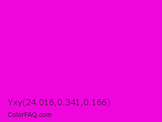 Yxy 24.016,0.341,0.166 Color is a normal magenta color and the nearest color is Purple Pizzazz #ff00cc. Hex code #f007de and RGB value is rgb(240,7,222). In RGB color space, this color is composed of 94% red, 3% green, 87% blue, In CMYK color space, this color is composed of 0% cyan, 97% magenta, 8% yellow , 6% black , In HSL color space, this color has a hue angle of 305° , 94% saturation and 48% lightness.