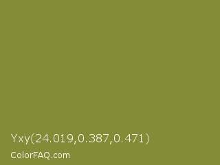 Yxy 24.019,0.387,0.471 Color is a normal yellow color and the nearest color is Sycamore #908d39. Hex code #858c37 and RGB value is rgb(133,140,55). In RGB color space, this color is composed of 52% red, 55% green, 22% blue, In CMYK color space, this color is composed of 5% cyan, 0% magenta, 61% yellow , 45% black , In HSL color space, this color has a hue angle of 65° , 44% saturation and 38% lightness.