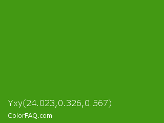 Yxy 24.023,0.326,0.567 Color is a normal green color and the nearest color is Vida Loca #549019. Hex code #439913 and RGB value is rgb(67,153,19). In RGB color space, this color is composed of 26% red, 60% green, 7% blue, In CMYK color space, this color is composed of 56% cyan, 0% magenta, 88% yellow , 40% black , In HSL color space, this color has a hue angle of 99° , 78% saturation and 34% lightness.