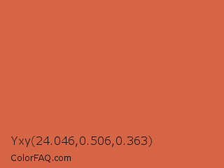 Yxy 24.046,0.506,0.363 Color is a normal red color and the nearest color is Red Damask #da6a41. Hex code #d66546 and RGB value is rgb(214,101,70). In RGB color space, this color is composed of 84% red, 40% green, 27% blue, In CMYK color space, this color is composed of 0% cyan, 53% magenta, 67% yellow , 16% black , In HSL color space, this color has a hue angle of 13° , 64% saturation and 56% lightness.