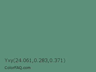 Yxy 24.061,0.283,0.371 Color is a normal green color and the nearest color is Wintergreen Dream #56887d. Hex code #5e917b and RGB value is rgb(94,145,123). In RGB color space, this color is composed of 37% red, 57% green, 48% blue, In CMYK color space, this color is composed of 35% cyan, 0% magenta, 15% yellow , 43% black , In HSL color space, this color has a hue angle of 154° , 21% saturation and 47% lightness.
