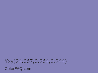 Yxy 24.067,0.264,0.244 Color is a light indigo color and the nearest color is Wild Blue Yonder #7a89b8. Hex code #8481b8 and RGB value is rgb(132,129,184). In RGB color space, this color is composed of 52% red, 51% green, 72% blue, In CMYK color space, this color is composed of 28% cyan, 30% magenta, 0% yellow , 28% black , In HSL color space, this color has a hue angle of 243° , 28% saturation and 61% lightness.