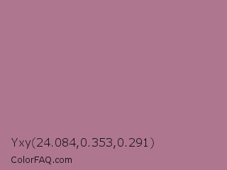 Yxy 24.084,0.353,0.291 Color is a normal rose color and the nearest color is English Lavender #b48395. Hex code #af7690 and RGB value is rgb(175,118,144). In RGB color space, this color is composed of 69% red, 46% green, 56% blue, In CMYK color space, this color is composed of 0% cyan, 33% magenta, 18% yellow , 31% black , In HSL color space, this color has a hue angle of 333° , 26% saturation and 57% lightness.