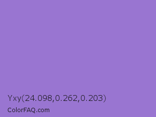 Yxy 24.098,0.262,0.203 Color is a light violet color and the nearest color is Lilac Bush #9874d3. Hex code #9975d1 and RGB value is rgb(153,117,209). In RGB color space, this color is composed of 60% red, 46% green, 82% blue, In CMYK color space, this color is composed of 27% cyan, 44% magenta, 0% yellow , 18% black , In HSL color space, this color has a hue angle of 263° , 50% saturation and 64% lightness.