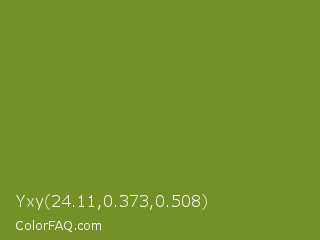 Yxy 24.11,0.373,0.508 Color is a normal lime color and the nearest color is Wasabi #788a25. Hex code #749127 and RGB value is rgb(116,145,39). In RGB color space, this color is composed of 45% red, 57% green, 15% blue, In CMYK color space, this color is composed of 20% cyan, 0% magenta, 73% yellow , 43% black , In HSL color space, this color has a hue angle of 76° , 58% saturation and 36% lightness.