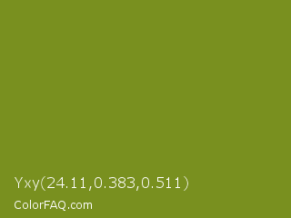Yxy 24.11,0.383,0.511 Color is a normal lime color and the nearest color is Wasabi #788a25. Hex code #79901f and RGB value is rgb(121,144,31). In RGB color space, this color is composed of 47% red, 56% green, 12% blue, In CMYK color space, this color is composed of 16% cyan, 0% magenta, 78% yellow , 44% black , In HSL color space, this color has a hue angle of 72° , 65% saturation and 34% lightness.
