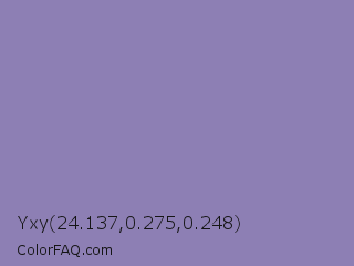 Yxy 24.137,0.275,0.248 Color is a normal indigo color and the nearest color is Lavender Purple #967bb6. Hex code #8d7fb4 and RGB value is rgb(141,127,180). In RGB color space, this color is composed of 55% red, 50% green, 71% blue, In CMYK color space, this color is composed of 22% cyan, 29% magenta, 0% yellow , 29% black , In HSL color space, this color has a hue angle of 256° , 26% saturation and 60% lightness.