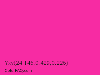 Yxy 24.146,0.429,0.226 Color is a normal magenta color and the nearest color is Persian Rose #fe28a2. Hex code #f72ba3 and RGB value is rgb(247,43,163). In RGB color space, this color is composed of 97% red, 17% green, 64% blue, In CMYK color space, this color is composed of 0% cyan, 83% magenta, 34% yellow , 3% black , In HSL color space, this color has a hue angle of 325° , 93% saturation and 57% lightness.