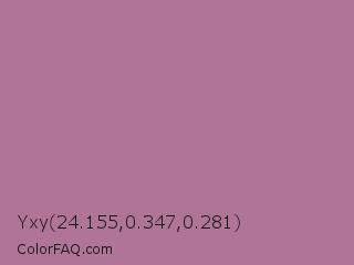 Yxy 24.155,0.347,0.281 Color is a normal magenta color and the nearest color is Bouquet #ae809e. Hex code #b07596 and RGB value is rgb(176,117,150). In RGB color space, this color is composed of 69% red, 46% green, 59% blue, In CMYK color space, this color is composed of 0% cyan, 34% magenta, 15% yellow , 31% black , In HSL color space, this color has a hue angle of 326° , 27% saturation and 57% lightness.