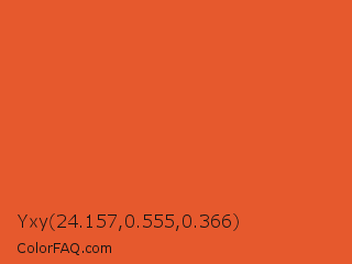 Yxy 24.157,0.555,0.366 Color is a normal red color and the nearest color is Vivid Vermilion #e56024. Hex code #e6592d and RGB value is rgb(230,89,45). In RGB color space, this color is composed of 90% red, 35% green, 18% blue, In CMYK color space, this color is composed of 0% cyan, 61% magenta, 80% yellow , 10% black , In HSL color space, this color has a hue angle of 14° , 79% saturation and 54% lightness.