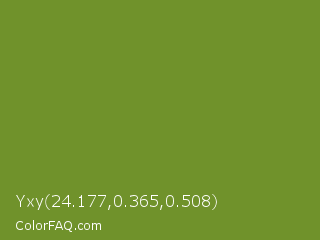 Yxy 24.177,0.365,0.508 Color is a normal green color and the nearest color is Olive Drab #6b8e23. Hex code #70922b and RGB value is rgb(112,146,43). In RGB color space, this color is composed of 44% red, 57% green, 17% blue, In CMYK color space, this color is composed of 23% cyan, 0% magenta, 71% yellow , 43% black , In HSL color space, this color has a hue angle of 80° , 54% saturation and 37% lightness.