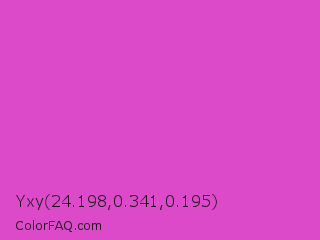 Yxy 24.198,0.341,0.195 Color is a normal magenta color and the nearest color is Steel Pink #cc33cc. Hex code #dc4ac9 and RGB value is rgb(220,74,201). In RGB color space, this color is composed of 86% red, 29% green, 79% blue, In CMYK color space, this color is composed of 0% cyan, 66% magenta, 9% yellow , 14% black , In HSL color space, this color has a hue angle of 308° , 68% saturation and 58% lightness.