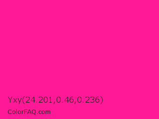 Yxy 24.201,0.46,0.236 Color is a normal magenta color and the nearest color is Fluorescent Pink #ff1493. Hex code #ff1996 and RGB value is rgb(255,25,150). In RGB color space, this color is composed of 100% red, 10% green, 59% blue, In CMYK color space, this color is composed of 0% cyan, 90% magenta, 41% yellow , 0% black , In HSL color space, this color has a hue angle of 327° , 100% saturation and 55% lightness.