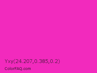 Yxy 24.207,0.385,0.2 Color is a normal magenta color and the nearest color is Razzle Dazzle Rose #ff33cc. Hex code #f22abd and RGB value is rgb(242,42,189). In RGB color space, this color is composed of 95% red, 16% green, 74% blue, In CMYK color space, this color is composed of 0% cyan, 83% magenta, 22% yellow , 5% black , In HSL color space, this color has a hue angle of 316° , 88% saturation and 56% lightness.