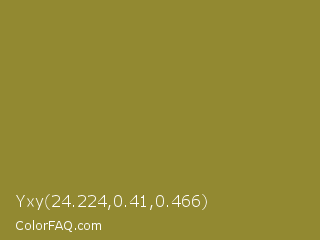 Yxy 24.224,0.41,0.466 Color is a normal yellow color and the nearest color is Sycamore #908d39. Hex code #928931 and RGB value is rgb(146,137,49). In RGB color space, this color is composed of 57% red, 54% green, 19% blue, In CMYK color space, this color is composed of 0% cyan, 6% magenta, 66% yellow , 43% black , In HSL color space, this color has a hue angle of 54° , 50% saturation and 38% lightness.