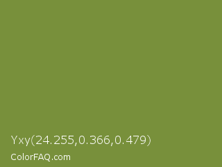 Yxy 24.255,0.366,0.479 Color is a normal lime color and the nearest color is Palm Leaf #6f9940. Hex code #78903b and RGB value is rgb(120,144,59). In RGB color space, this color is composed of 47% red, 56% green, 23% blue, In CMYK color space, this color is composed of 17% cyan, 0% magenta, 59% yellow , 44% black , In HSL color space, this color has a hue angle of 77° , 42% saturation and 40% lightness.
