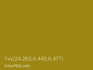 Yxy 24.262,0.443,0.477 Color is a normal yellow color and the nearest color is Dark Yellow #9b870c. Hex code #9d8612 and RGB value is rgb(157,134,18). In RGB color space, this color is composed of 62% red, 53% green, 7% blue, In CMYK color space, this color is composed of 0% cyan, 15% magenta, 89% yellow , 38% black , In HSL color space, this color has a hue angle of 50° , 79% saturation and 34% lightness.