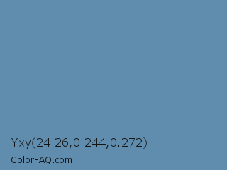 Yxy 24.26,0.244,0.272 Color is a normal blue color and the nearest color is Air Force Blue RAF #5d8aa8. Hex code #608cad and RGB value is rgb(96,140,173). In RGB color space, this color is composed of 38% red, 55% green, 68% blue, In CMYK color space, this color is composed of 45% cyan, 19% magenta, 0% yellow , 32% black , In HSL color space, this color has a hue angle of 206° , 32% saturation and 53% lightness.