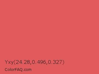 Yxy 24.28,0.496,0.327 Color is a light red color and the nearest color is Roman #de6360. Hex code #e15b5d and RGB value is rgb(225,91,93). In RGB color space, this color is composed of 88% red, 36% green, 36% blue, In CMYK color space, this color is composed of 0% cyan, 60% magenta, 59% yellow , 12% black , In HSL color space, this color has a hue angle of 359° , 69% saturation and 62% lightness.
