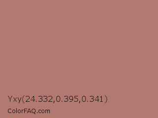 Yxy 24.332,0.395,0.341 Color is a normal red color and the nearest color is Copper Penny #ad6f69. Hex code #b27971 and RGB value is rgb(178,121,113). In RGB color space, this color is composed of 70% red, 47% green, 44% blue, In CMYK color space, this color is composed of 0% cyan, 32% magenta, 37% yellow , 30% black , In HSL color space, this color has a hue angle of 7° , 30% saturation and 57% lightness.