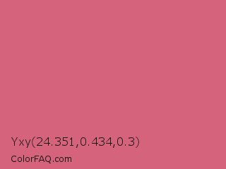 Yxy 24.351,0.434,0.3 Color is a light red color and the nearest color is Cinnamon Satin #cd607e. Hex code #d4637b and RGB value is rgb(212,99,123). In RGB color space, this color is composed of 83% red, 39% green, 48% blue, In CMYK color space, this color is composed of 0% cyan, 53% magenta, 42% yellow , 17% black , In HSL color space, this color has a hue angle of 347° , 57% saturation and 61% lightness.
