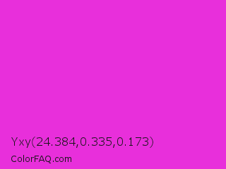 Yxy 24.384,0.335,0.173 Color is a normal magenta color and the nearest color is Razzle Dazzle Rose #ff33cc. Hex code #e82fdb and RGB value is rgb(232,47,219). In RGB color space, this color is composed of 91% red, 18% green, 86% blue, In CMYK color space, this color is composed of 0% cyan, 80% magenta, 6% yellow , 9% black , In HSL color space, this color has a hue angle of 304° , 80% saturation and 55% lightness.