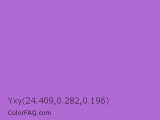 Yxy 24.409,0.282,0.196 Color is a light purple color and the nearest color is Rich Lilac #b666d2. Hex code #b16ad4 and RGB value is rgb(177,106,212). In RGB color space, this color is composed of 69% red, 42% green, 83% blue, In CMYK color space, this color is composed of 17% cyan, 50% magenta, 0% yellow , 17% black , In HSL color space, this color has a hue angle of 280° , 55% saturation and 62% lightness.