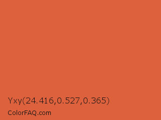 Yxy 24.416,0.527,0.365 Color is a normal red color and the nearest color is Medium Vermilion #d9603b. Hex code #de613d and RGB value is rgb(222,97,61). In RGB color space, this color is composed of 87% red, 38% green, 24% blue, In CMYK color space, this color is composed of 0% cyan, 56% magenta, 73% yellow , 13% black , In HSL color space, this color has a hue angle of 13° , 71% saturation and 55% lightness.