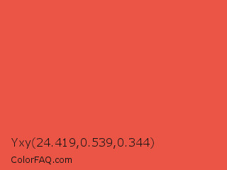 Yxy 24.419,0.539,0.344 Color is a normal red color and the nearest color is Carmine Pink #eb4c42. Hex code #ea5545 and RGB value is rgb(234,85,69). In RGB color space, this color is composed of 92% red, 33% green, 27% blue, In CMYK color space, this color is composed of 0% cyan, 64% magenta, 71% yellow , 8% black , In HSL color space, this color has a hue angle of 6° , 80% saturation and 59% lightness.