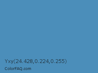 Yxy 24.428,0.224,0.255 Color is a normal blue color and the nearest color is Cyan Azure #4e82b4. Hex code #4b8eba and RGB value is rgb(75,142,186). In RGB color space, this color is composed of 29% red, 56% green, 73% blue, In CMYK color space, this color is composed of 60% cyan, 24% magenta, 0% yellow , 27% black , In HSL color space, this color has a hue angle of 204° , 45% saturation and 51% lightness.