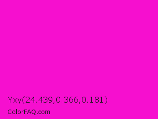 Yxy 24.439,0.366,0.181 Color is a normal magenta color and the nearest color is Shocking Pink #fc0fc0. Hex code #f60fcf and RGB value is rgb(246,15,207). In RGB color space, this color is composed of 96% red, 6% green, 81% blue, In CMYK color space, this color is composed of 0% cyan, 94% magenta, 16% yellow , 4% black , In HSL color space, this color has a hue angle of 310° , 93% saturation and 51% lightness.