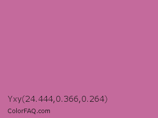 Yxy 24.444,0.366,0.264 Color is a normal magenta color and the nearest color is Hopbush #d06da1. Hex code #c46a9c and RGB value is rgb(196,106,156). In RGB color space, this color is composed of 77% red, 42% green, 61% blue, In CMYK color space, this color is composed of 0% cyan, 46% magenta, 20% yellow , 23% black , In HSL color space, this color has a hue angle of 327° , 43% saturation and 59% lightness.