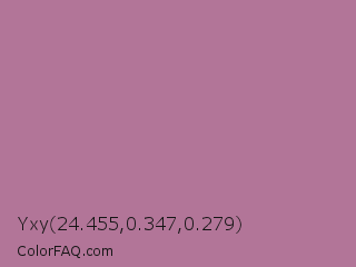 Yxy 24.455,0.347,0.279 Color is a normal magenta color and the nearest color is Bouquet #ae809e. Hex code #b27598 and RGB value is rgb(178,117,152). In RGB color space, this color is composed of 70% red, 46% green, 60% blue, In CMYK color space, this color is composed of 0% cyan, 34% magenta, 15% yellow , 30% black , In HSL color space, this color has a hue angle of 326° , 28% saturation and 58% lightness.