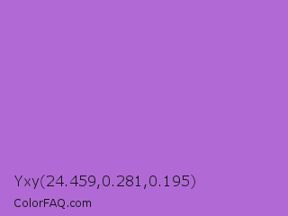 Yxy 24.459,0.281,0.195 Color is a light purple color and the nearest color is Rich Lilac #b666d2. Hex code #b16ad5 and RGB value is rgb(177,106,213). In RGB color space, this color is composed of 69% red, 42% green, 84% blue, In CMYK color space, this color is composed of 17% cyan, 50% magenta, 0% yellow , 16% black , In HSL color space, this color has a hue angle of 280° , 56% saturation and 63% lightness.