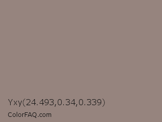Yxy 24.493,0.34,0.339 Color is a normal color and the nearest color is Cinereous #98817b. Hex code #96847e and RGB value is rgb(150,132,126). In RGB color space, this color is composed of 59% red, 52% green, 49% blue, In CMYK color space, this color is composed of 0% cyan, 12% magenta, 16% yellow , 41% black , In HSL color space, this color has a hue angle of 15° , 10% saturation and 54% lightness.