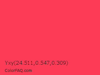Yxy 24.511,0.547,0.309 Color is a light red color and the nearest color is Sizzling Red #ff3855. Hex code #fc3b57 and RGB value is rgb(252,59,87). In RGB color space, this color is composed of 99% red, 23% green, 34% blue, In CMYK color space, this color is composed of 0% cyan, 77% magenta, 65% yellow , 1% black , In HSL color space, this color has a hue angle of 351° , 97% saturation and 61% lightness.