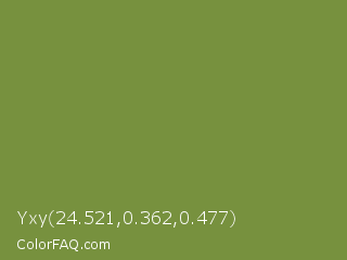 Yxy 24.521,0.362,0.477 Color is a normal lime color and the nearest color is Palm Leaf #6f9940. Hex code #77913e and RGB value is rgb(119,145,62). In RGB color space, this color is composed of 47% red, 57% green, 24% blue, In CMYK color space, this color is composed of 18% cyan, 0% magenta, 57% yellow , 43% black , In HSL color space, this color has a hue angle of 79° , 40% saturation and 41% lightness.