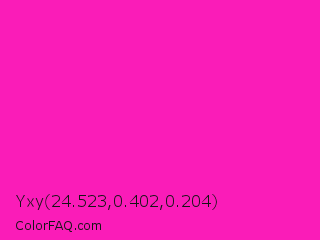 Yxy 24.523,0.402,0.204 Color is a normal magenta color and the nearest color is Shocking Pink #fc0fc0. Hex code #fa1cb8 and RGB value is rgb(250,28,184). In RGB color space, this color is composed of 98% red, 11% green, 72% blue, In CMYK color space, this color is composed of 0% cyan, 89% magenta, 26% yellow , 2% black , In HSL color space, this color has a hue angle of 318° , 96% saturation and 55% lightness.