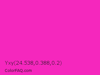 Yxy 24.538,0.388,0.2 Color is a normal magenta color and the nearest color is Razzle Dazzle Rose #ff33cc. Hex code #f527bd and RGB value is rgb(245,39,189). In RGB color space, this color is composed of 96% red, 15% green, 74% blue, In CMYK color space, this color is composed of 0% cyan, 84% magenta, 23% yellow , 4% black , In HSL color space, this color has a hue angle of 316° , 91% saturation and 56% lightness.